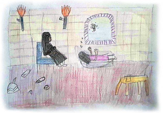 Con motivo de Halloween publico este microrrelato, ilustrado con el dibujo ganador resultante de un pequeño concurso que convoqué en casa…